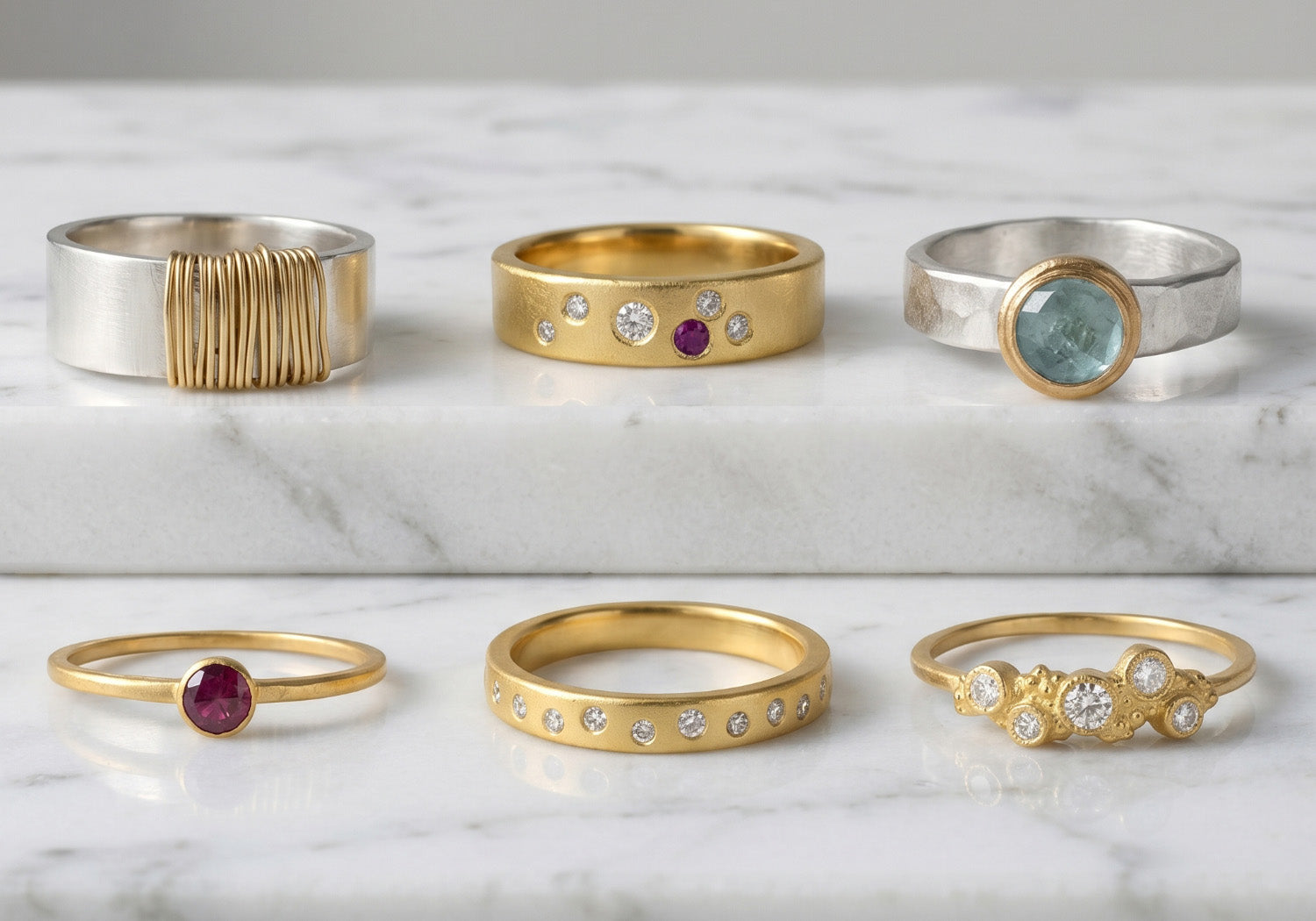 Made by hand, each ring blends clean design, rich metals, and carefully set stones—crafted to wear beautifully for years.