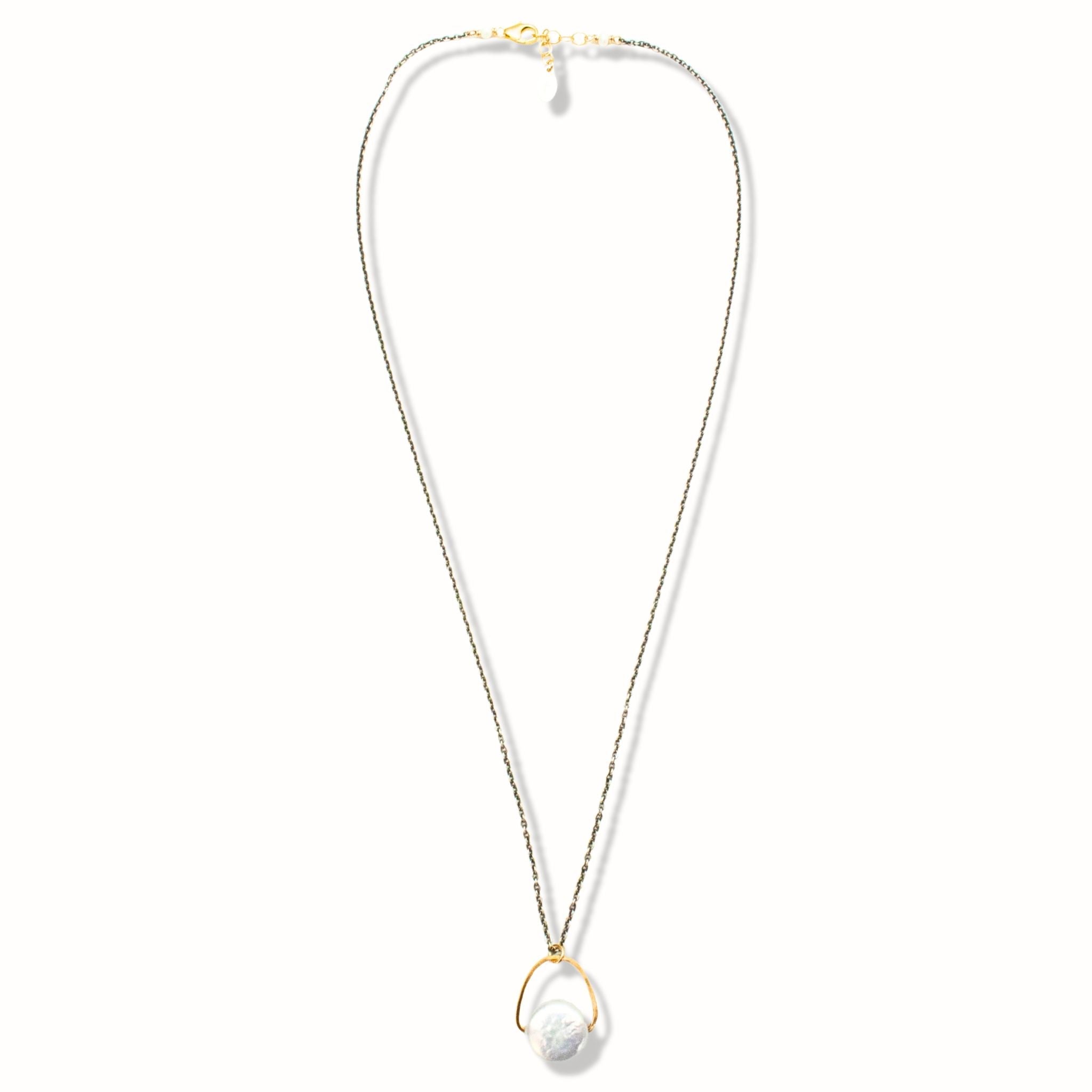 The pendant hangs on an oxidized sterling silver chain, 18" in length with a 1" extender (18-19" total), and fastens with a secure lobster clasp. The contrast between the dark chain and warm gold hanger adds striking visual depth while maintaining minimalist elegance.