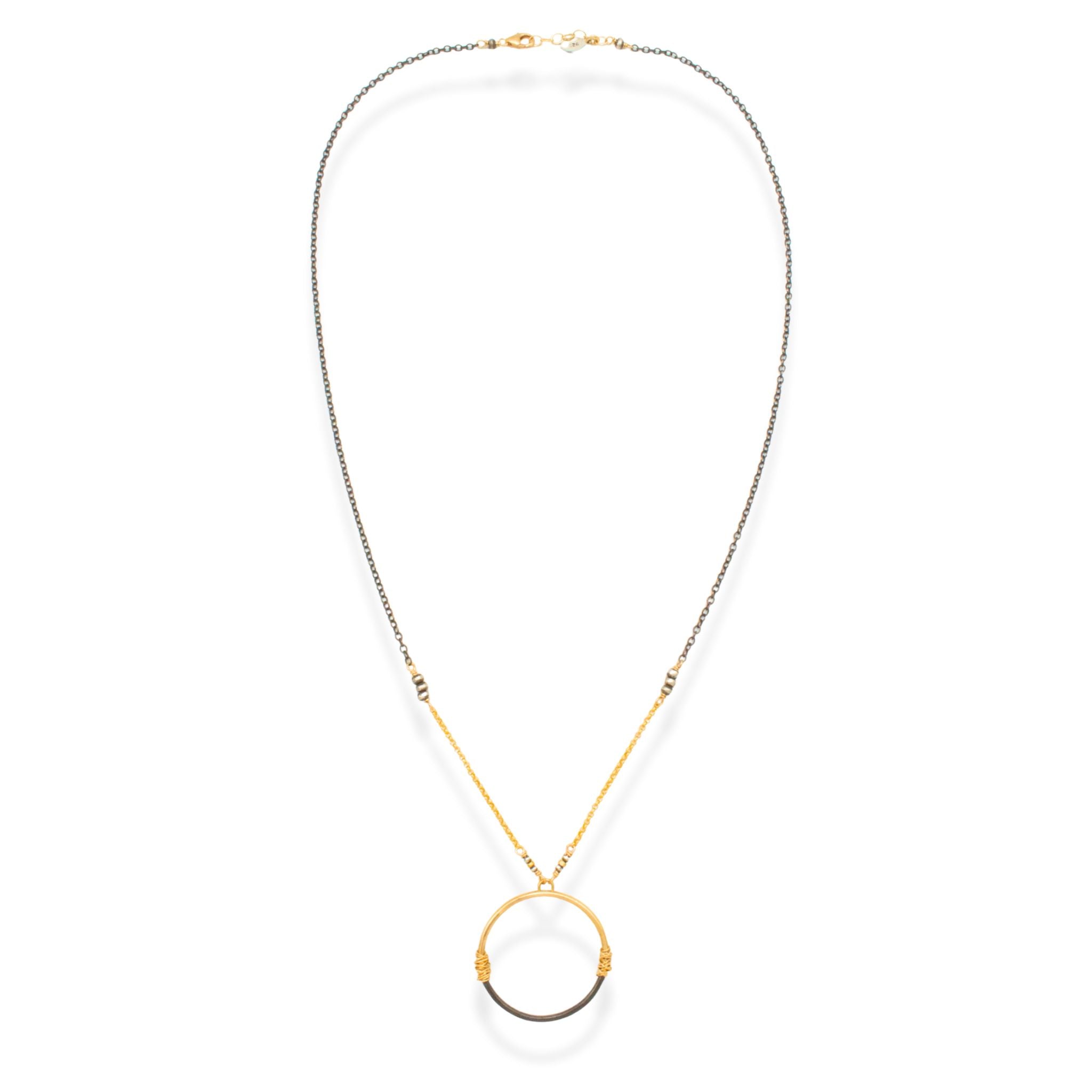 Contemporary contrast defines our Two-Tone Circle Pendant Necklace, featuring a striking circle pendant with artisan wire wrapping in both warm 14K gold-filled and dark oxidized finishes. The two-tone design creates sophisticated visual interest that complements any style.